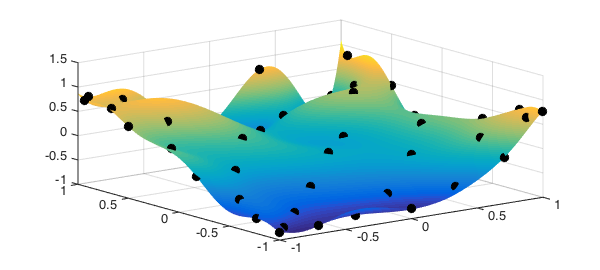 f = @(x,y) cos(exp(2*x+y)).*sin(y); fx = f(x(:,1), x(:,2)); % Samples from Padua grid F = chebfun2(fx, [-1 1 -1 1], 'padua'); % Construct Chebfun2 from samples plot(F), hold on plot3(x(:,1), x(:,2), F(x(:,1), x(:,2)), 'ok', 'MarkerFaceColor', 'k'), hold off